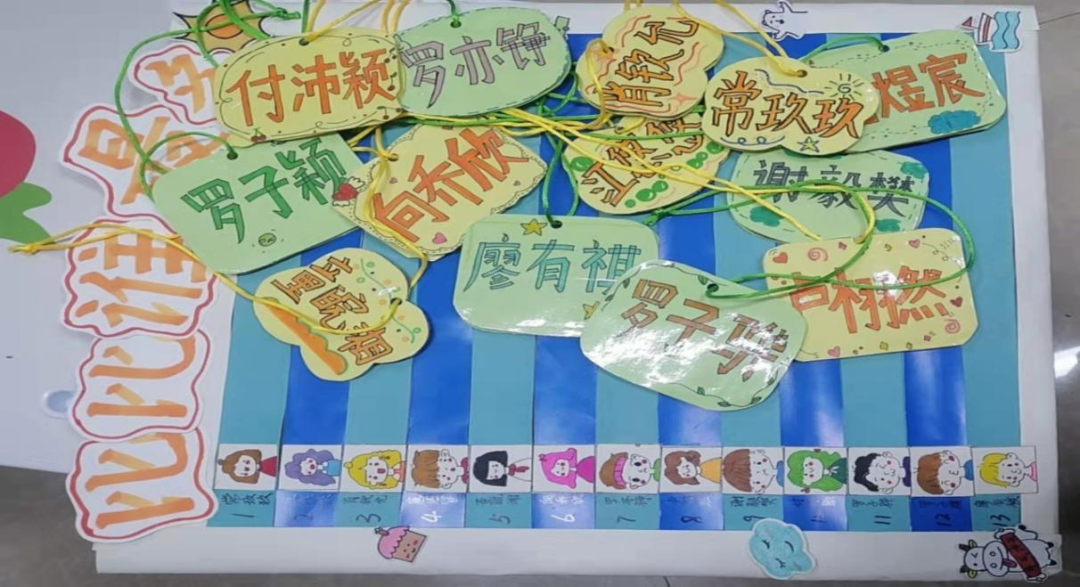 同学们自制的姓名卡片和每日比拼张贴画