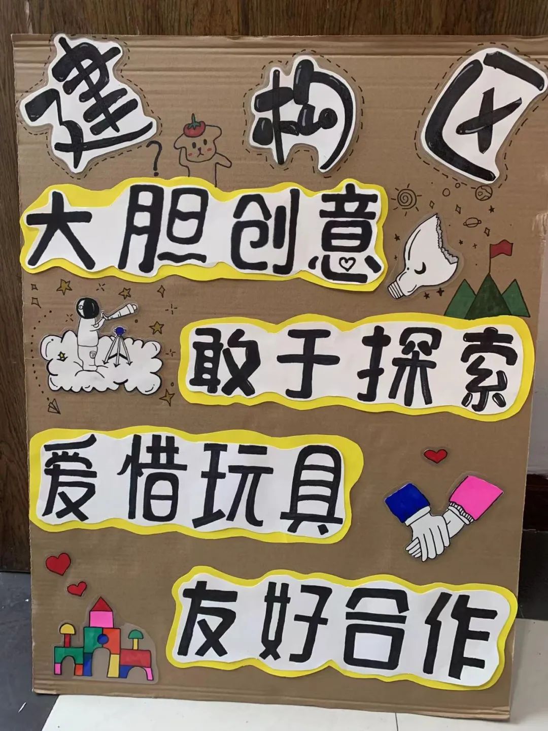 志愿者们来到幼儿园,首先从分区规划、区域设置、材料投放、作品呈现、建构等方面与带队老师进行了深入探讨,商议方案,然后在老师们的指导下开展创设布置。志愿者们认真的涂画、裁剪,关注着每一个小小的细节,在她们的努力下,建构区也在慢慢变得温馨和美丽起来,幼儿园面貌焕然一新。