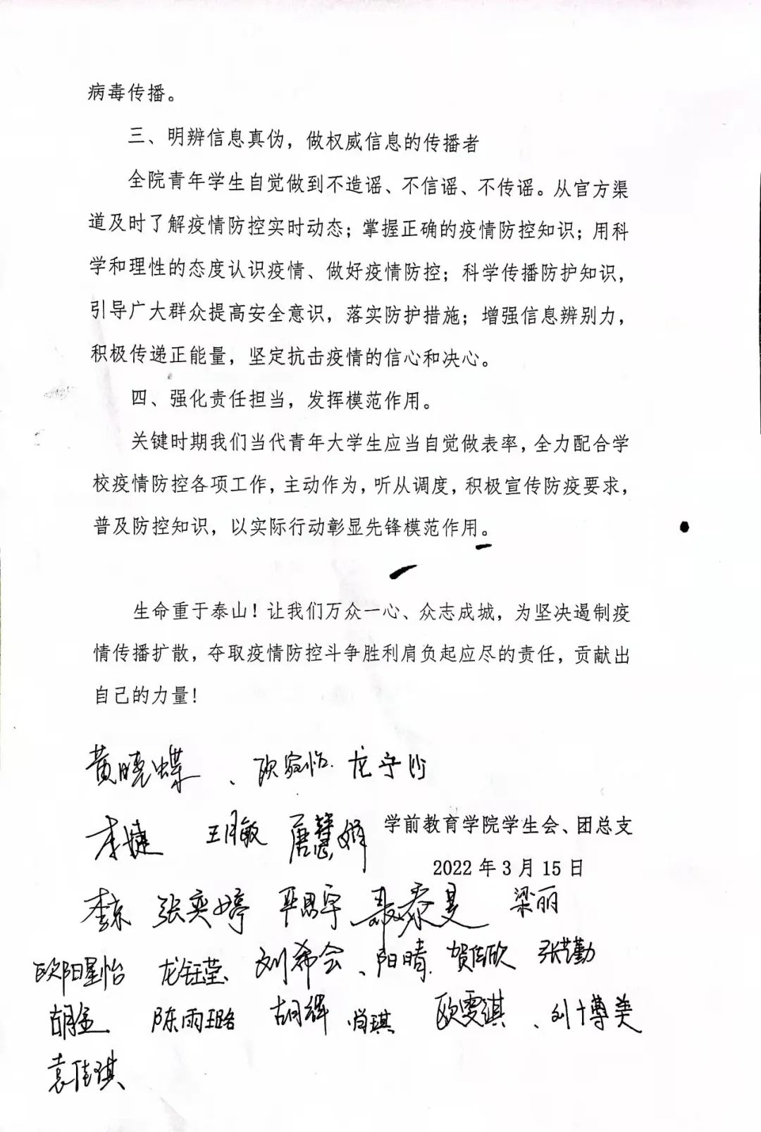 2022年2月以来,国内疫情形势日益严峻,吉林、山东、上海、深圳等地区每日新增确诊病例呈指数级增长,一些省市还出现了校园内的聚集性疫情。湖南目前也确诊7例,3月13日新增省外输入1例。疫情当下,作为当代青年大学生,守护生命安全、保卫美丽校园是我们共同的责任,我们应增强大局意识,与学校同心同行,从自身做起,为维护校园健康安全、和谐稳定贡献青春力量。在此,衡阳幼高专学前教育学院学生会、团总支向全体同学发出如下倡议: 一、积极配合防疫工作,非必要不离衡 响应国家防疫工作号召,积极配合学校和当地的防疫工作。非必要不出市、不旅行。减少不必要外出,不参加聚集性活动,不去人员密集场所,尽量不在外进餐,减少接触公共物品。每日按时完成学校体温检测的晨午检,一旦出现发热、咳嗽等症状,应及时报告辅导员和校医,并到医疗机构发热门诊就诊。 二、养成良好卫生习惯,做好个人防护 从严从紧从细做好个人防护工作,在公共区域自觉佩戴口罩,餐厅就餐时间隔就餐,勤洗手、勤消毒、多通风;讲究卫生,保持教室和寝室的整洁通风;合理处置废弃口罩、生活垃圾;餐余垃圾封口后再扔至公共垃圾桶,养成良好的生活卫生习惯,阻断病毒传播。 三、明辨信息真伪,做权威信息的传播者 全院青年学生自觉做到不造谣、不信谣、不传谣。从官方渠道及时了解疫情防控实时动态;掌握正确的疫情防控知识;用科学和理性的态度认识疫情、做好疫情防控;科学传播防护知识,引导广大群众提高安全意识,落实防护措施;增强信息辨别力,积极传递正能量,坚定抗击疫情的信心和决心。 四、强化责任担当,发挥模范作用。 关键时期我们当代青年大学生应当自觉做表率,全力配合学校疫情防控各项工作,主动作为,听从调度,积极宣传防疫要求,普及防控知识,以实际行动彰显先锋模范作用。 生命重于泰山!让我们万众一心、众志成城,为坚决遏制疫情传播扩散,夺取疫情防控斗争胜利肩负起应尽的责任,贡献出自己的力量! 编辑 | 刘姣 文稿 | 学生会 团总支 图片|团总支宣传部 责任编辑 | 陈琴 严思宇 一审 | 吴迪 终审 | 刘东航