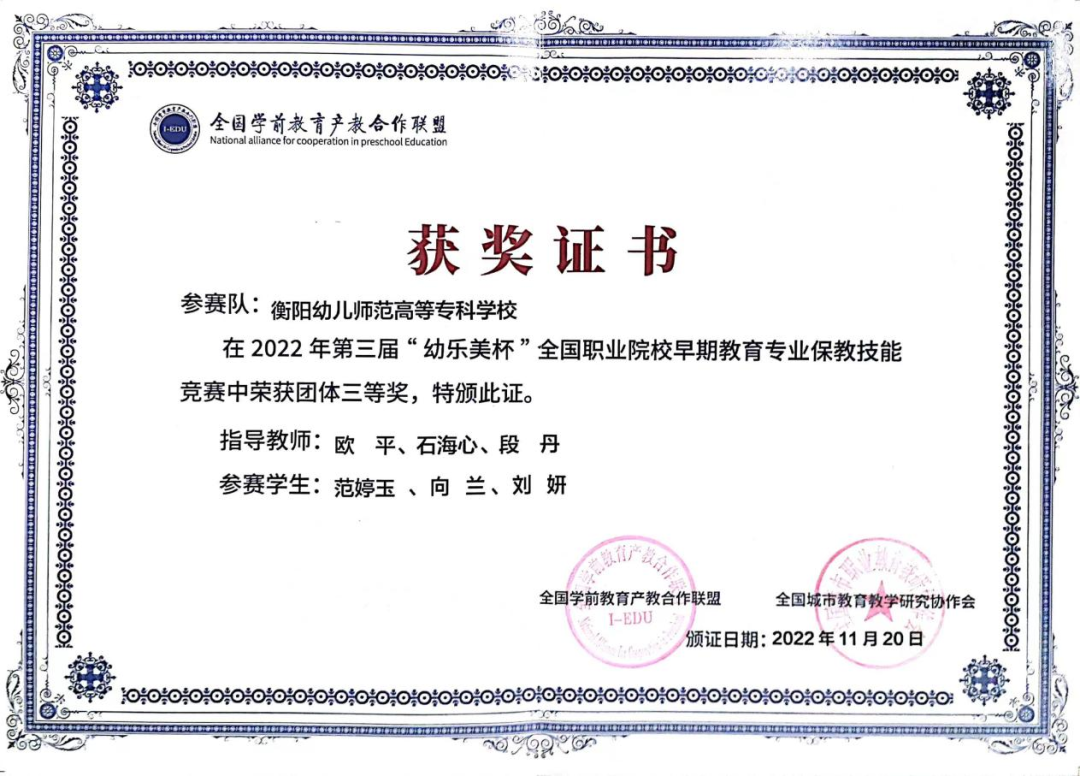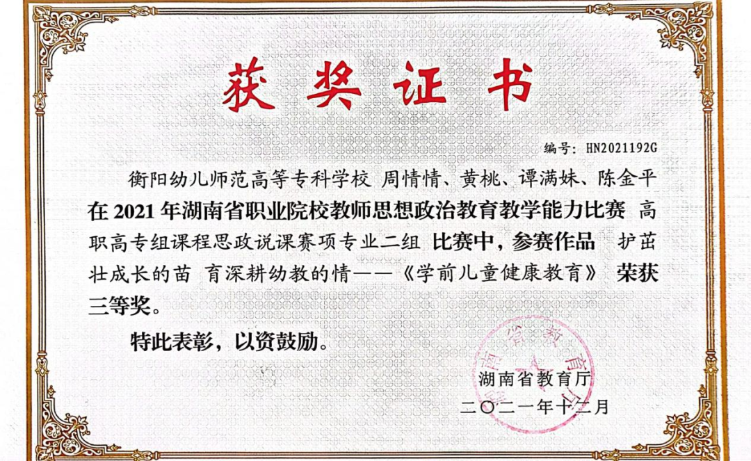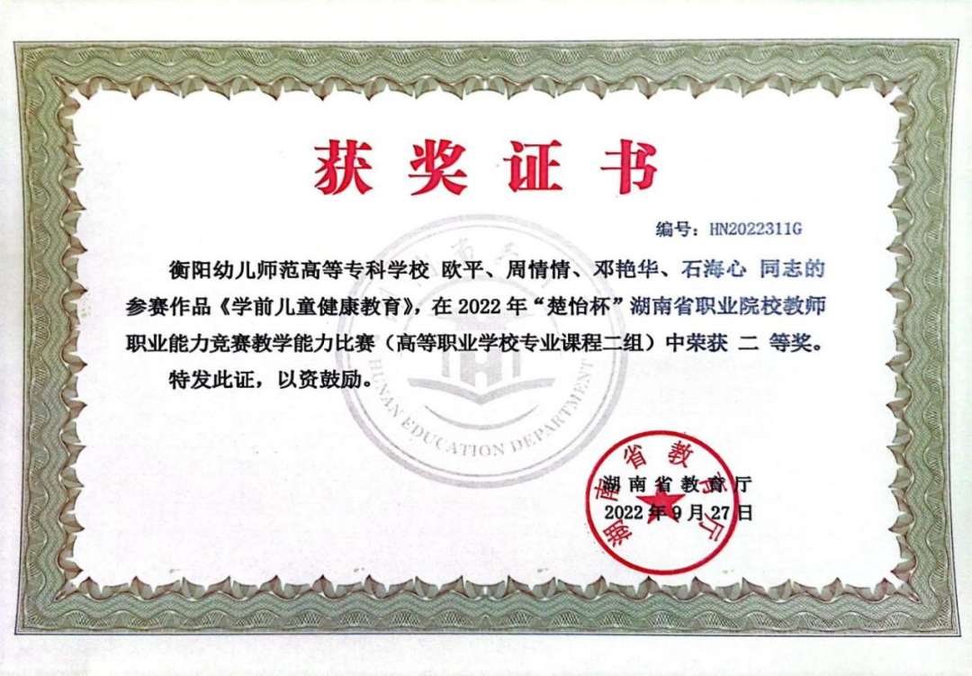 近年来我系教育教学及科研成果丰硕,仅2022年一年学前教育专业教师在省级以上竞赛获奖就达19项,教师立项课题5项,在研课题16项,主编和参编教材16部,发表论文10余篇,获奖论文12篇,申请专利2项。学生学习积极参加各级各类比赛,获奖颇丰,参加湖南省职业院校技能竞赛多次获省赛二等奖和三等奖,2022年我系学生参加技能竞赛获得省级以上奖项6项。学生考级考证通过率高,学生教师资格证考试通过率达74.22%。