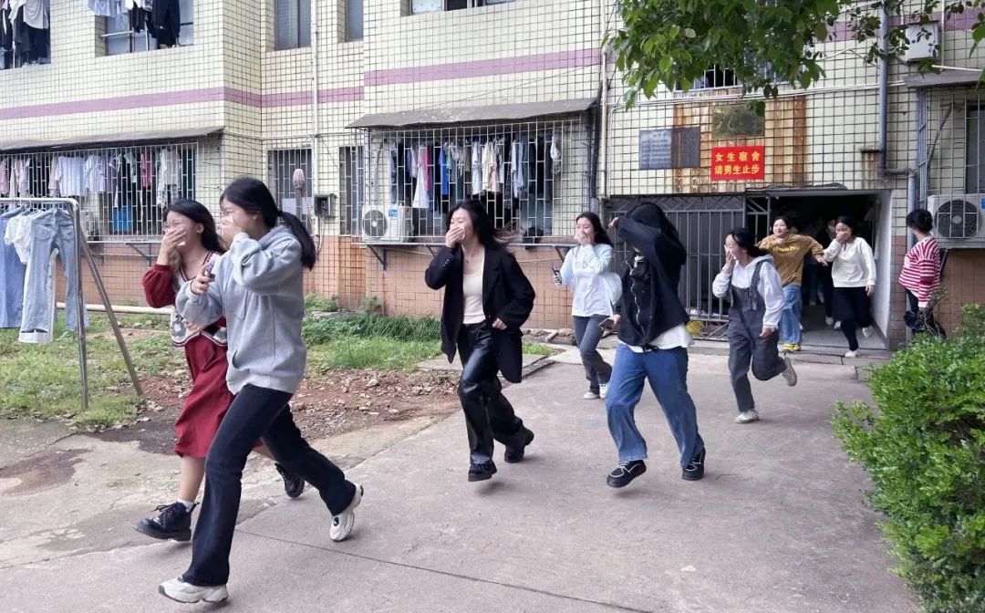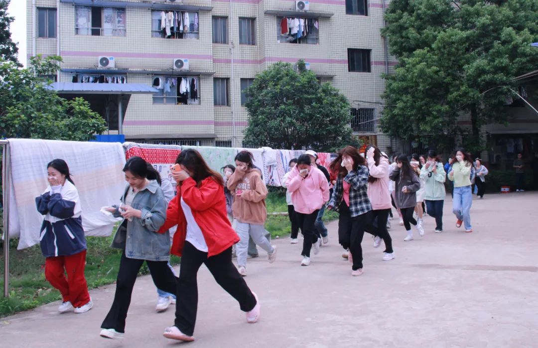 演练时间一到,宿舍楼内响起了急促的“火警”警报声,在辅导员的组织下,学生用湿毛巾或衣袖捂住口鼻、俯身小跑,按照规定路线井然有序地跑下楼梯,奔向教室。楼梯的每一个拐角都有老师看护、引导,全系学生全部及时从宿舍安全撤离到教学楼。最后辅导员清点人数,报告疏散情况,整个演练过程安全、快速、有序地进行。