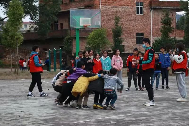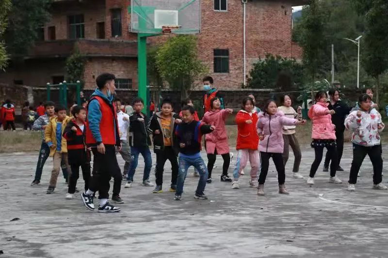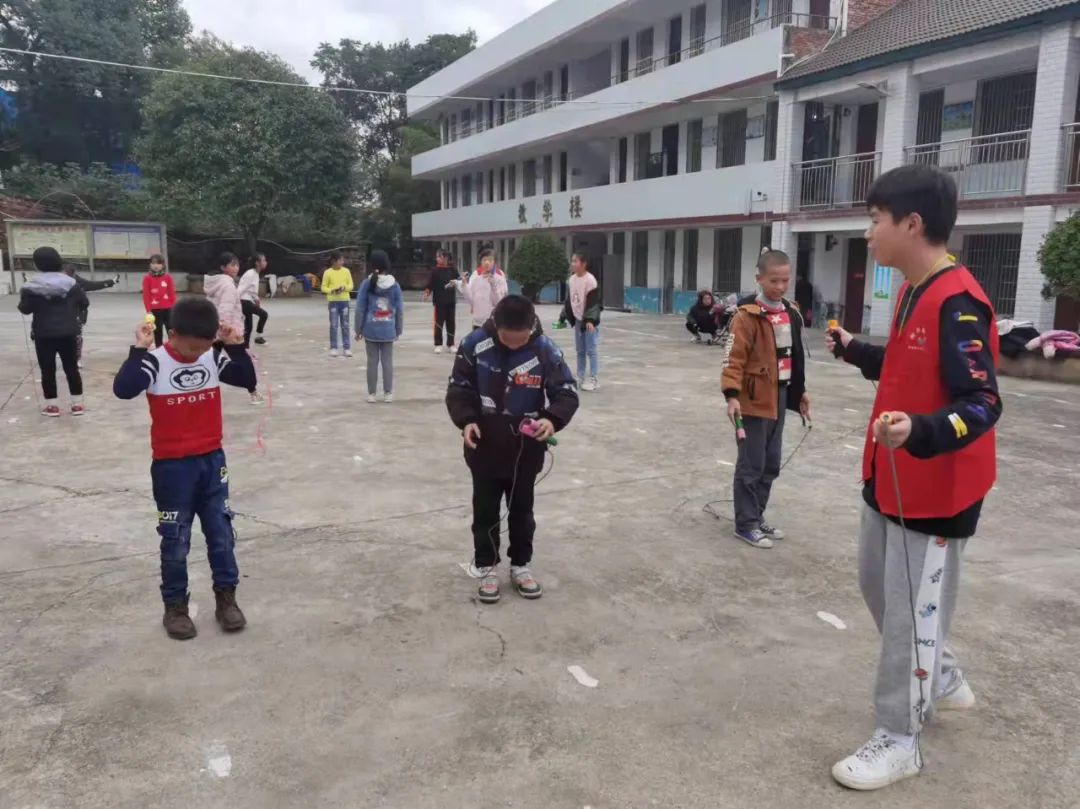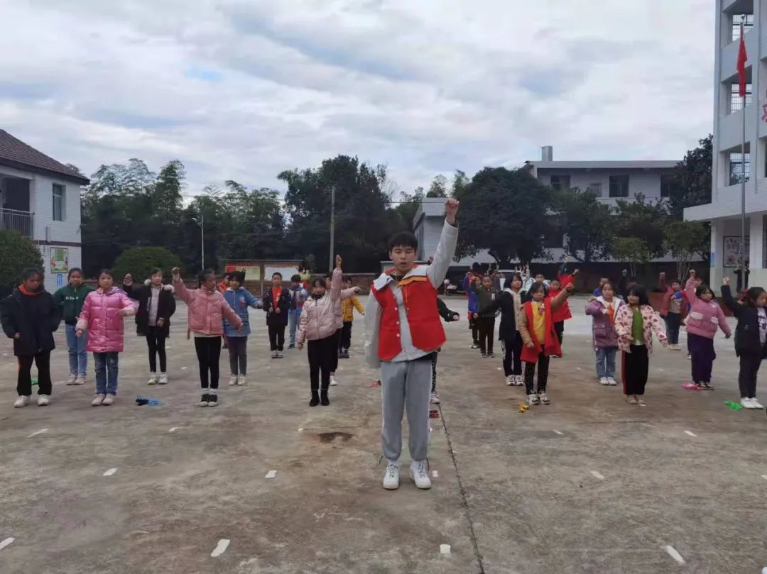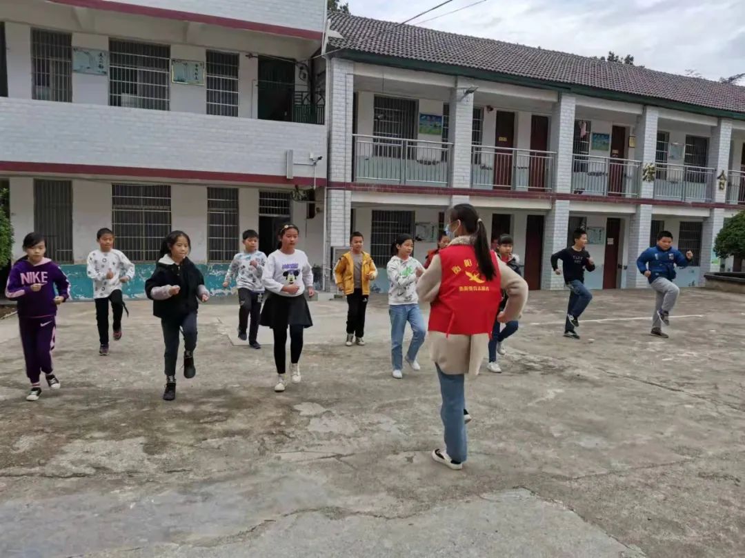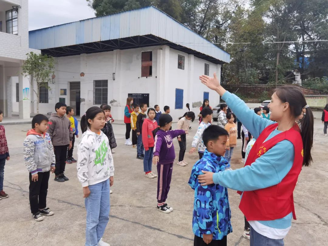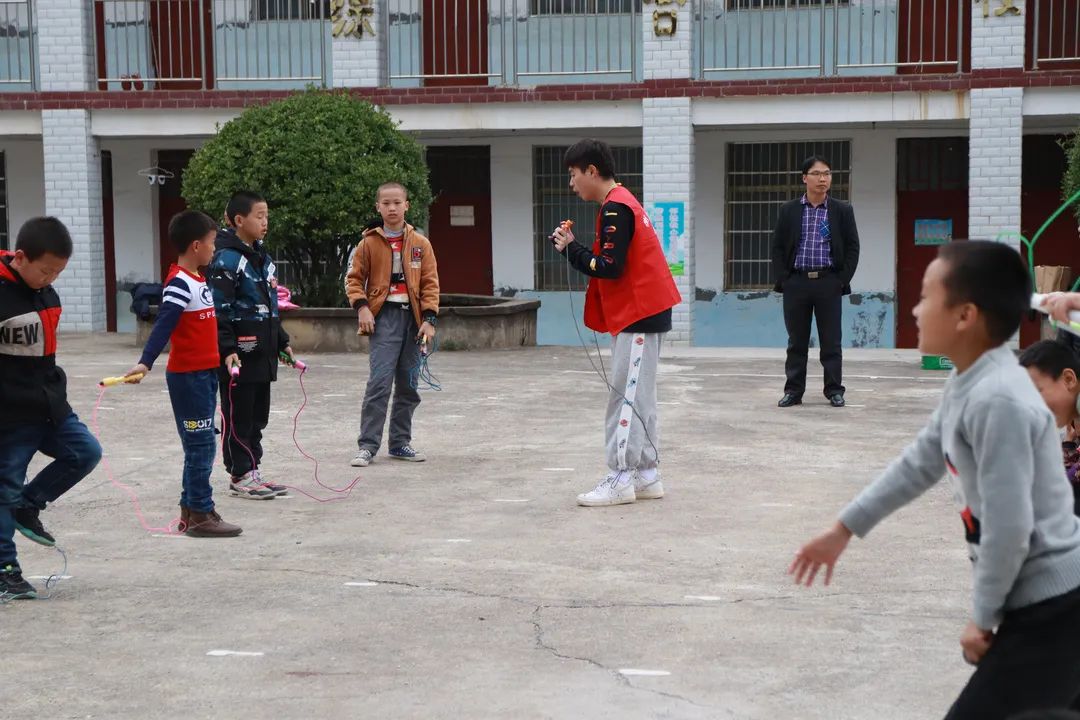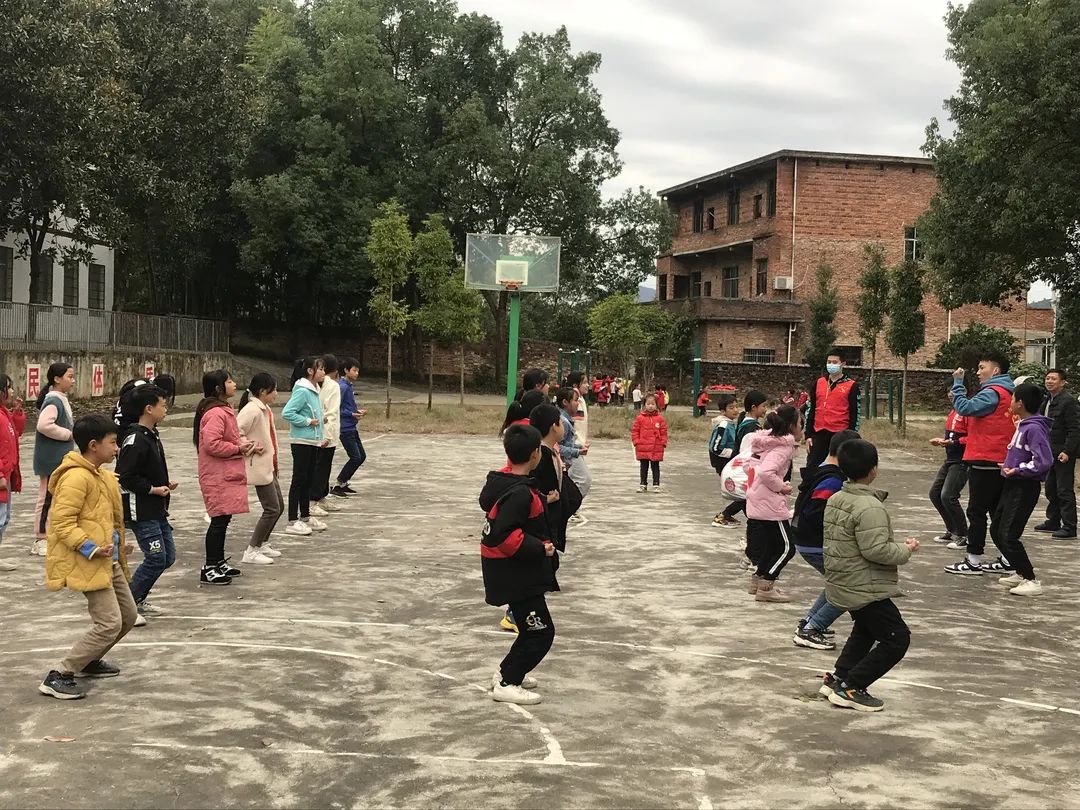 为了进一步落实结对帮扶工作,在2021年11月9日的中午,我们小教、数理学院组织了一批“同心牵手”支教志愿者再次乘大巴来到了常宁市洋泉镇同心村杉树完小。不同于上次的调研,在这次活动中,我们组织了老师志愿者和学生志愿者开展了第一次课后服务志愿活动:课间律动、趣味武术、花式跳绳、小小主持人等。