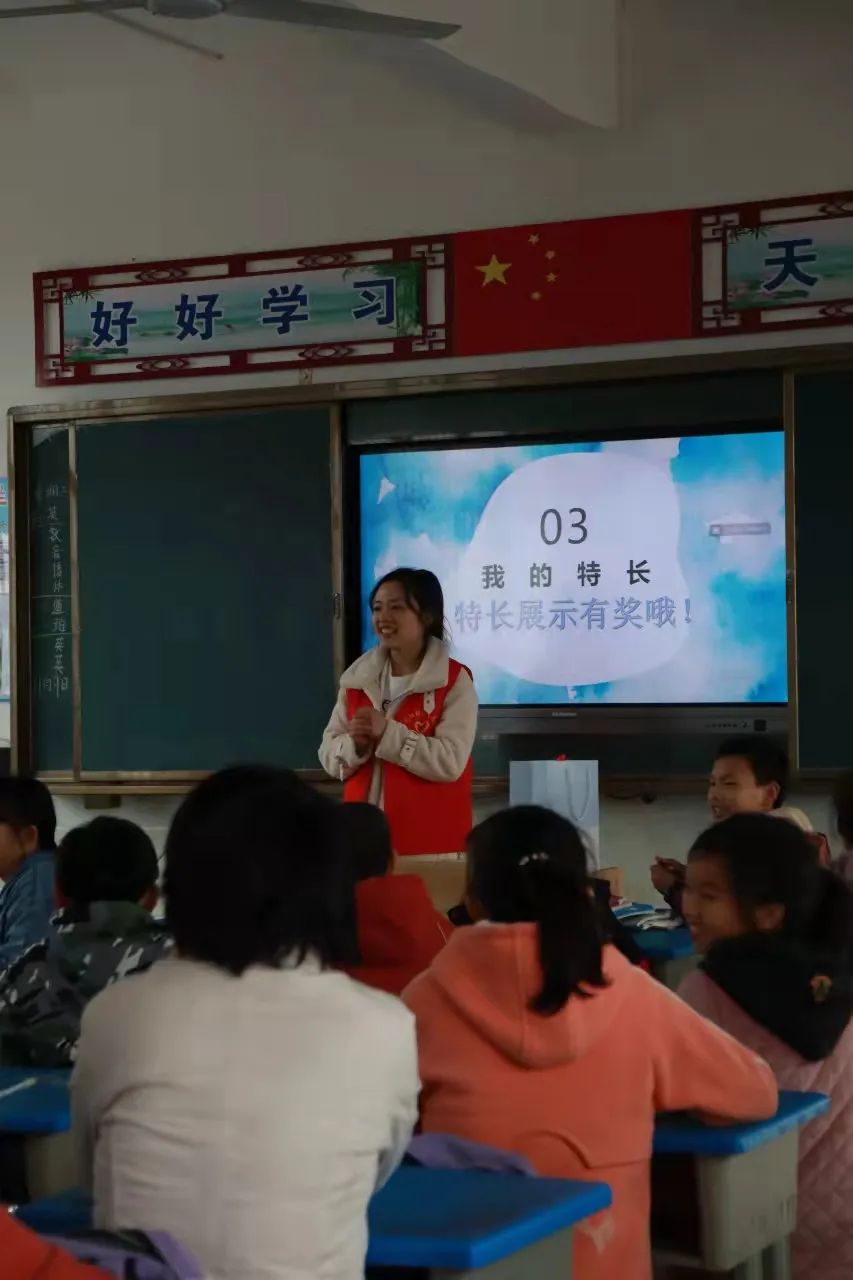 同学们积极配合志愿老师们,挥舞着他们的小手,踩着音乐的节拍,跳着属于他们的天真无邪。 杉树完小的老师们也跟着一起舞动,她们将来会是杉树完小的艺术专干,希望她们今后能自己开展多彩的艺术活动! 《花式跳绳》 由丁妍小团队带领的花式跳绳,吸引了所有老师领导和小朋友的目光,孩子们跳着属于他们的花样年华,笑声在操场上荡漾。此时此刻,他们比骄阳还要耀眼,恣意燃烧着他们的激情,犹如大旱后的甘霖浇开了心灵之花。 《趣味武术》 张诤诤老师的小团队有声有色,把小朋友带到了一个新的世界,武功谁最强,舍我其谁。学习武术的目的,不仅仅是为了强身健体,更是潜移默化的传承。希望他们能在武术的学习中领会到中华优秀传统文化的魅力。 《小小主持人》 志愿老师们用小游戏拉近了彼此的距离,化解了因为害羞而产生的尴尬,让孩子们能够在讲台上肆意展现自我,将自己隐藏的光芒尽情展露,被蒙尘的钻石怎么甘心一直黯淡呢? 蒋水平老师发现,幼高专志愿者队造成了家长的围观,他们的心里产生了一次强烈的震动!以前不愿意参加课后活动的学生也强烈要求参加了。“市里大学来乡村小学啦”,相信这句话不久就会成为美谈在民间流传。 姚赛红老师也发出感慨:“今天的支教,给乡村孩子们带去了丰富的艺术活动体验,更是让我们小教、数理院同去的助教大学生们得到了迅速的成长。在带队老师的指导下,小教、数理院的学生们也得到了校方的高度赞扬。我们不但送去了小教学院、数理学院的专业教师力量,也收获了小学师生的情谊”。 周晶晶同学表示:“昨天经历一个很特别的下午,很荣幸来到杉树完小带领同学们上了一堂很有趣的播音课 。刚开始特别紧张,怕自己不能把所学的播音知识很好的教给她们,可当我看到一张张可爱的面孔,她们瞪大圆圆的眼睛可爱的看着我,我顿时变得轻松了,小朋友们全程很配合我,让我觉得原来我可以做好小老师。傍晚要准备回校时,她们拉着我的手,强烈要求我去她们家住,我心中便油然而生不舍之情,非常期待与她们的再次相见”。 课后交流 课后服务后,我们随机找了两位可爱的小同学进行采访,让我们来看看她们对这次活动的看法吧! 我们还采访了完小的校长,听听他怎么看待我们这次的活动呢? 挥手告别 在最后将要离开的时候,孩子们围在大巴周围依依不舍的挥着手,一声声说着再见,离别的惆怅笼罩在大巴里。但是我们都知道,世上没有不散的宴席,大家只能在心里殷殷期待着下次的再见。 这次活动让我们看到了同学们对新鲜事物的热情,这份热情就像冬日里的暖阳,源源不断的散发着他们的光和热,也让靠近的人被这份温暖深深打动着。同时,对于活动中那些即将成为人民教师的志愿者们也是一次深刻地感悟吧,或许成长就在这一刻悄然发芽了呢。